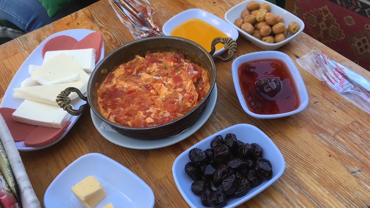 Speaking of breakfast, the menu features a delightful array of options that reflect the rich culinary traditions of Turkey. Dive into a plate brimming with two perfectly cooked egg dishes, a tempting selection of cheeses, both black and green olives, sweet honey, and luscious strawberry preserves. The delightfully varied bread basket is a must, alongside crispy fried pastry cigars stuffed with cheese and a side of golden fries. Not to forget, the refreshing tea complements your meal, making every sip as enjoyable as the last bite.